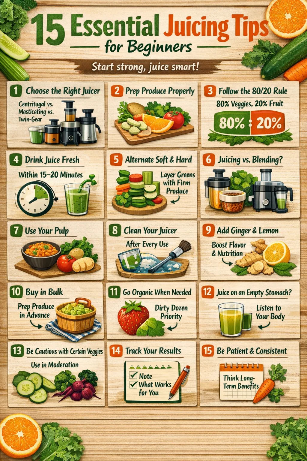 Segala-galanya — teknik lanjutan, penyusunan pemakanan, strategi membeli-belah hasil — dibina di atas asas itu. 15 petua di bawah merangkumi gambaran penuh, daripada memilih pemerah jus yang betul kepada memaksimumkan apa yang berakhir di dalam gelas anda.