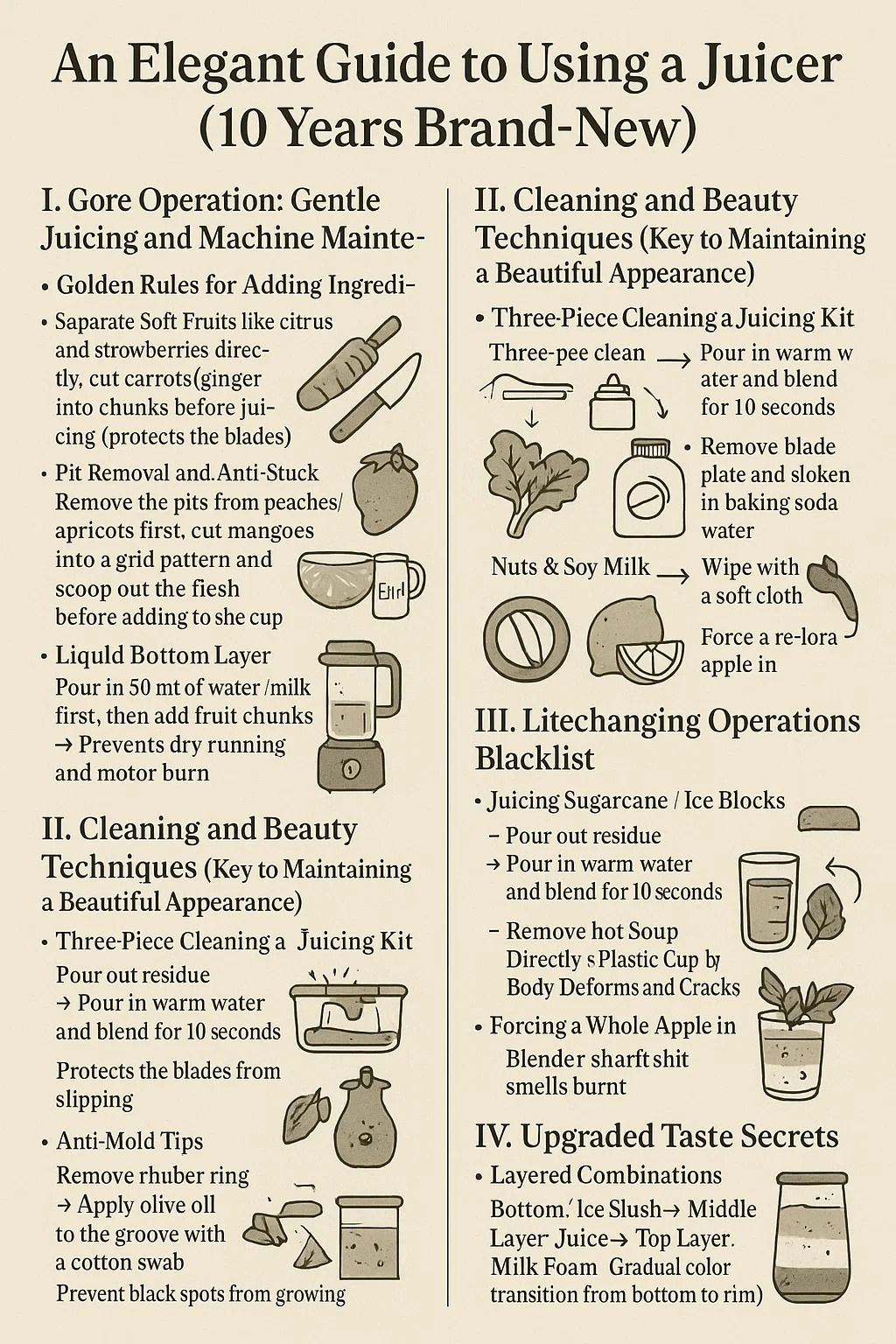 Berikut adalah panduan yang elegan untuk menggunakan a Juicer , digabungkan dengan pengalaman praktikal, untuk memastikan mesin anda kelihatan baru walaupun selepas sepuluh tahun: