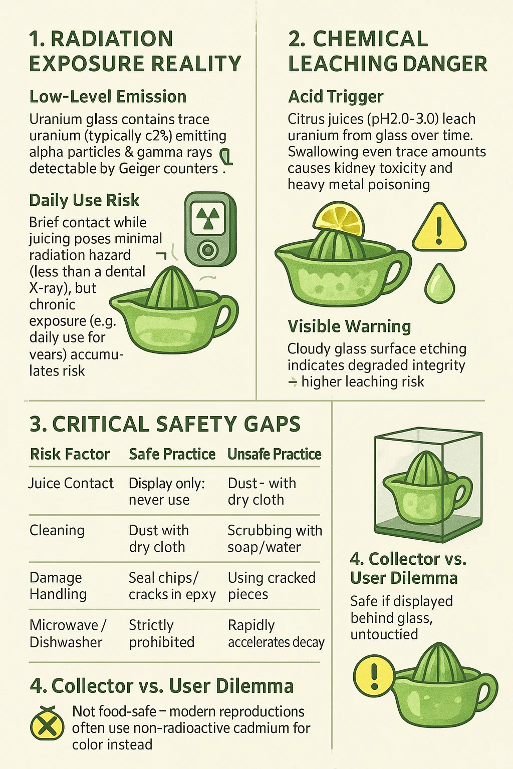 Pencetus asid: Jus sitrus (pH 2.0-3.0) Leach uranium dari kaca dari masa ke masa. Menelan walaupun jumlah jejak menyebabkan ketoksikan buah pinggang dan keracunan logam berat.