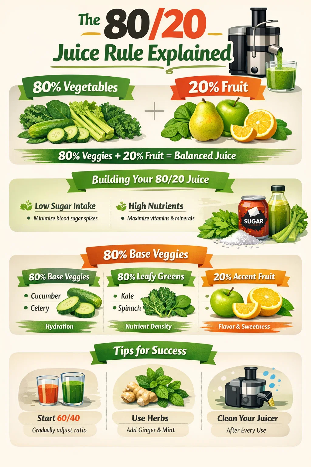 The Peraturan 80/20 untuk membuat jus ialah garis panduan pemakanan yang menyatakan bahawa untuk setiap gelas jus yang anda hasilkan, 80% bahan haruslah sayur-sayuran dan hanya 20% sahaja buah-buahan . Nisbah ini direka untuk memaksimumkan pengambilan fitonutrien dan mineral sambil mengehadkan penggunaan fruktosa dengan ketat. Semasa menggunakan yang berkualiti tinggi pemerah jus menjadikannya mudah untuk mencipta ramuan yang lazat, bergantung terlalu banyak pada buah-buahan manis boleh menyebabkan kenaikan gula darah yang tidak diingini, mengalahkan banyak tujuan kesihatan pengekstrakan segar.