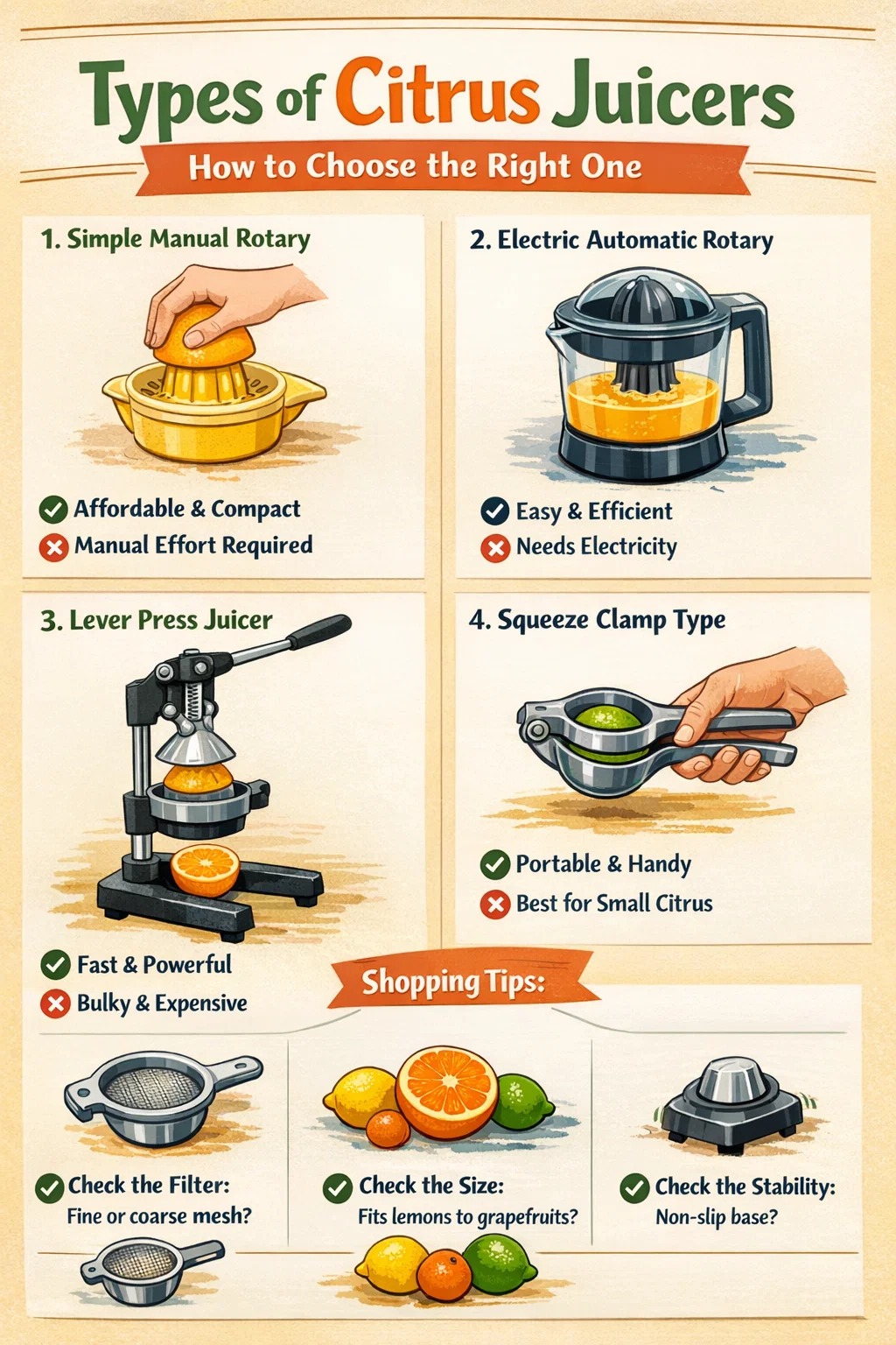 Kebaikan dan Keburukan: Mudah digunakan dan dibersihkan; walau bagaimanapun, ia hanya sesuai untuk limau atau limau kecil, dan tidak cukup kuat untuk oren yang lebih besar.